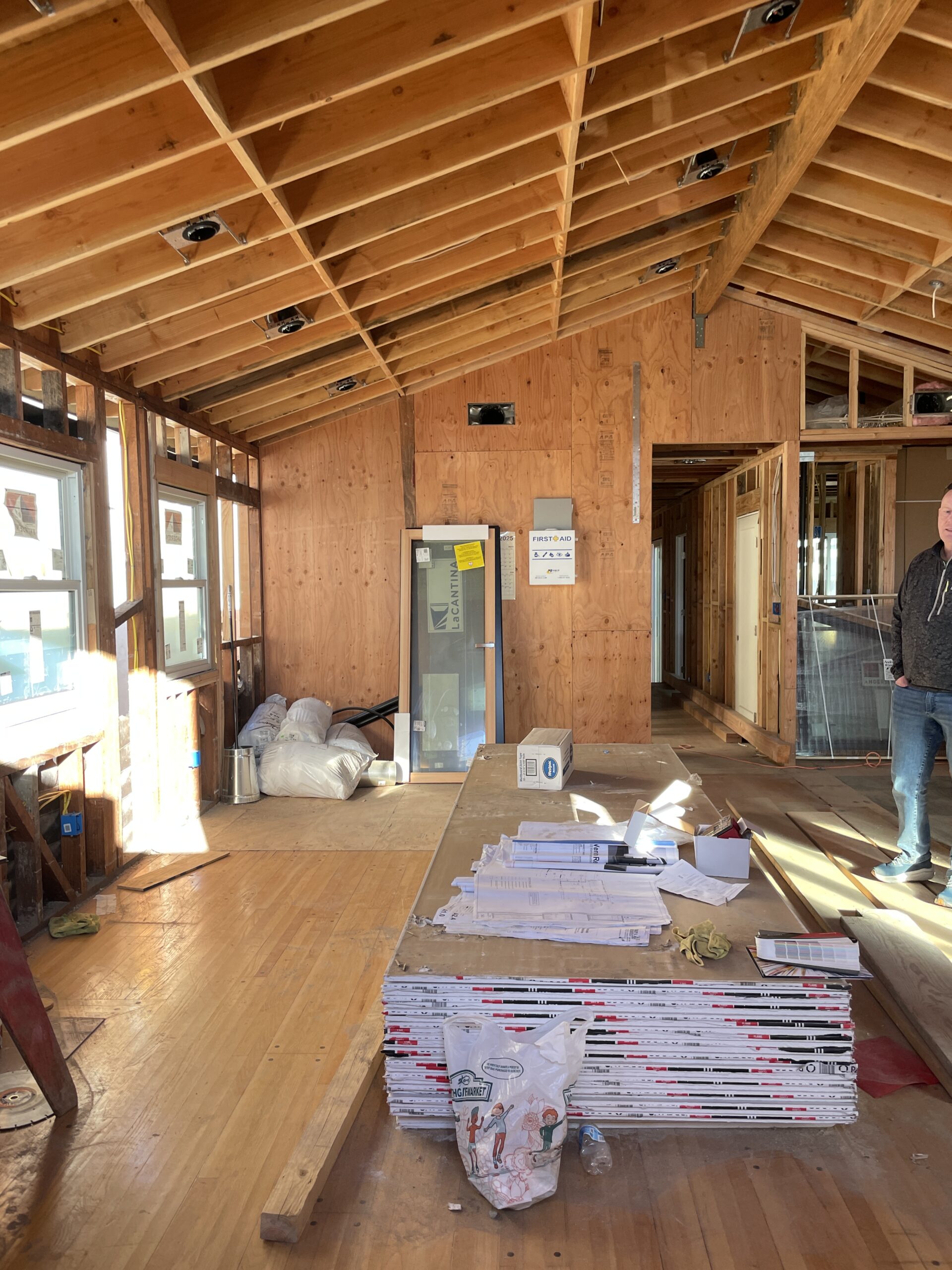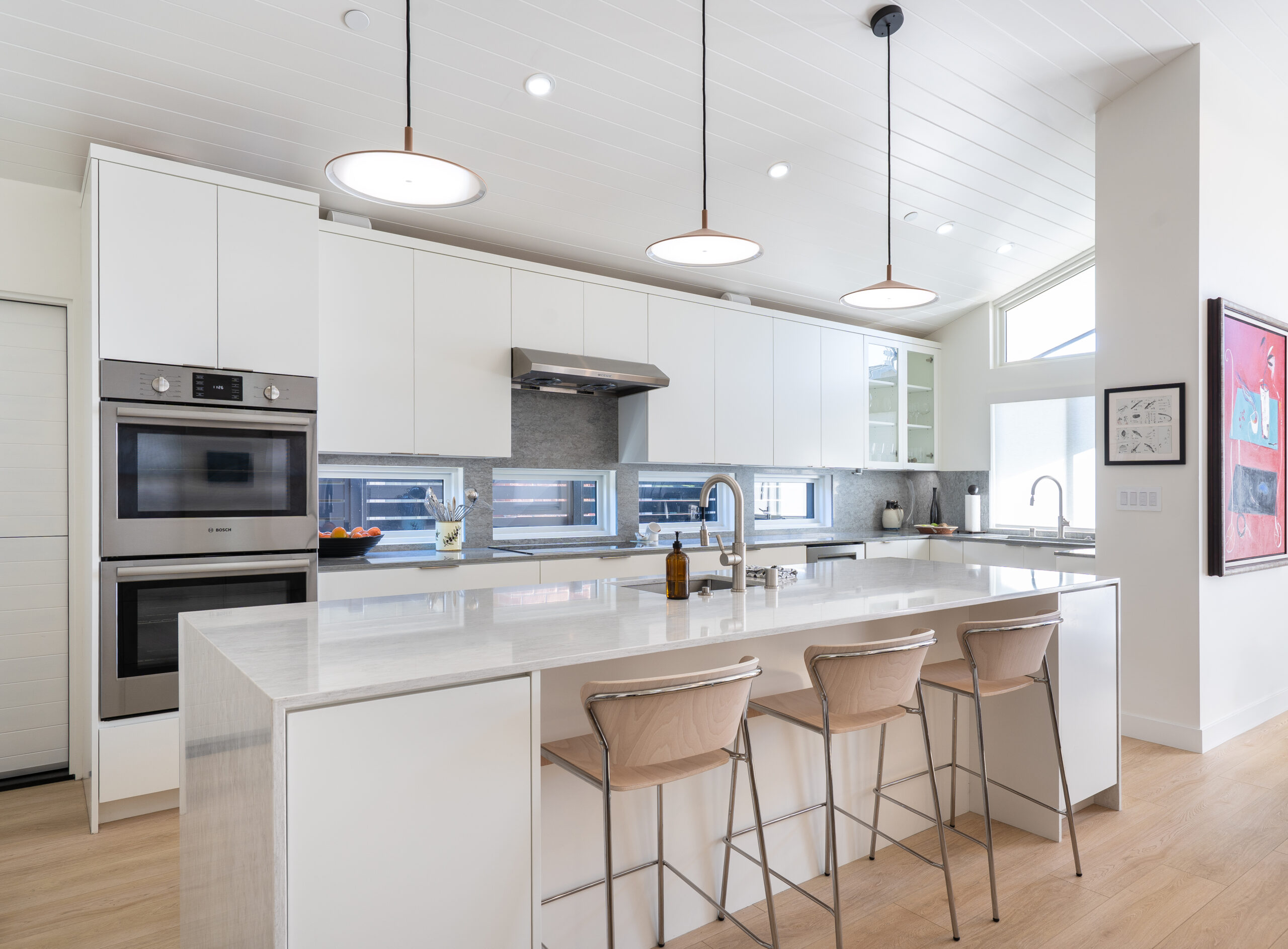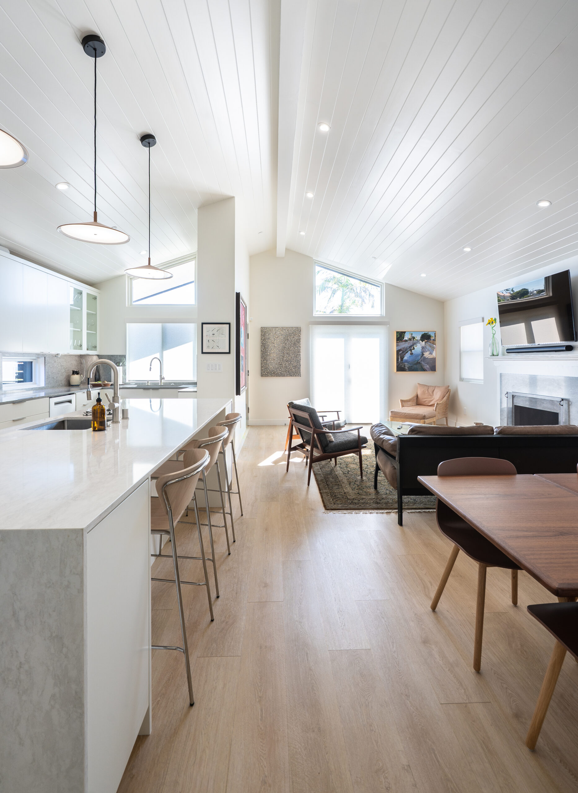 We reimagined the main living area as an open-plan environment, extending the kitchen and integrating it seamlessly into the primary gathering space for entertaining. Vaulted ceilings were introduced in both the main living area and the primary bedroom, creating a greater sense of volume and architectural interest. This intervention also made way for clerestory windows, allowing natural light to pour in and brighten the interiors.