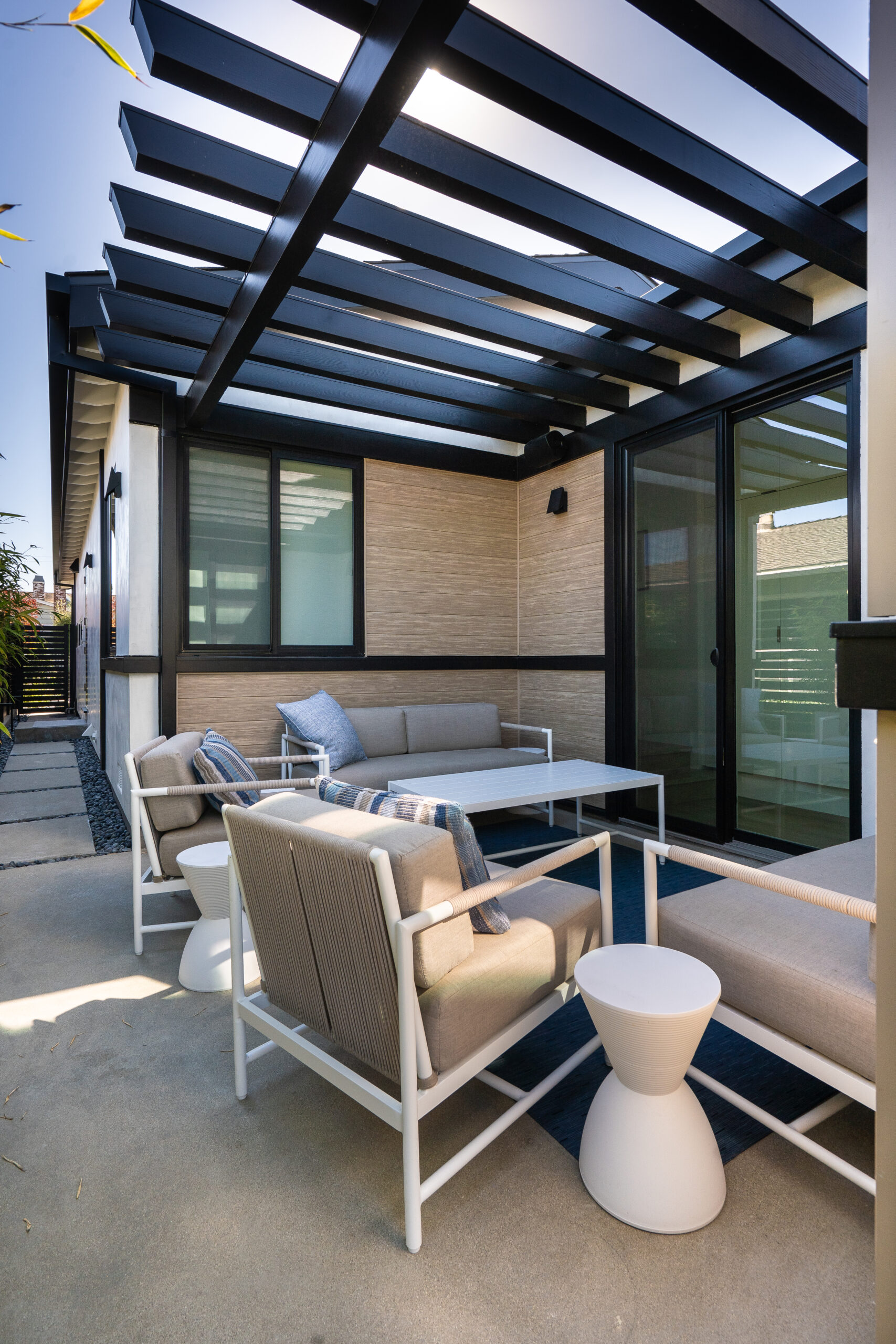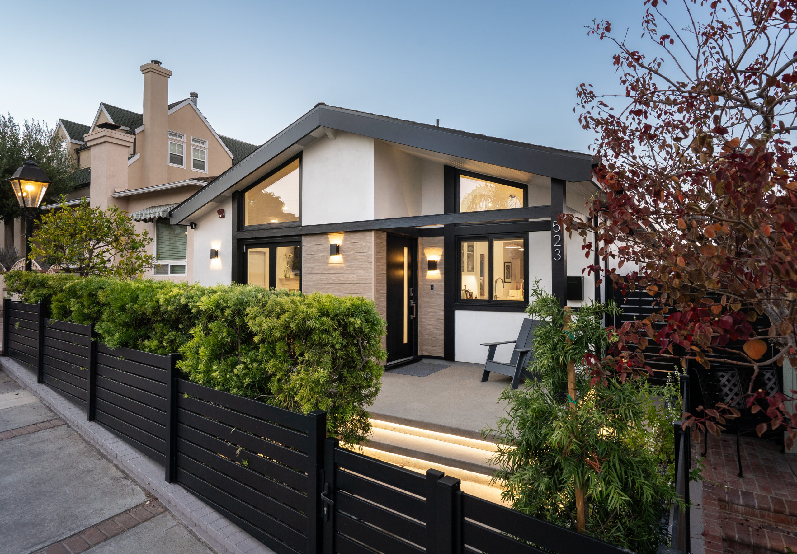 While the home was significantly transformed, the original footprint was preserved—maintaining valuable outdoor space on the narrow lot. This includes a private front porch and garden, as well as an interior courtyard with a trellis, offering moments of openness and connection to the outdoors.